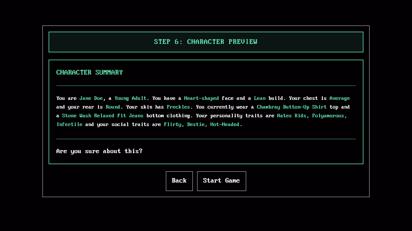 Uh… a sandbox text-based life simulation game with sex. That’s it. Imagine Sims but text-based with sex, yeah.