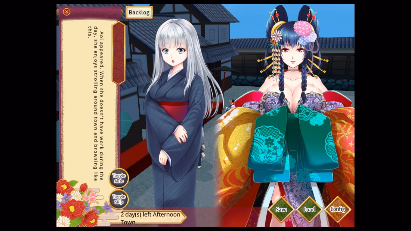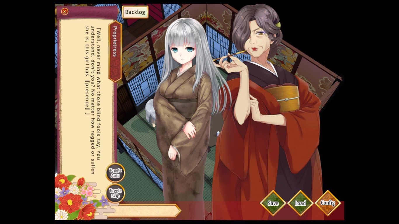This is a short fantasy game set in a dazzling 3D recreation of a pleasure district during the Edo period. Players can freely explore the small area, interact with characters, and guide Chihaya’s growth. She begins withdrawn and unable to converse properly, but through gifts, shared experiences, and lessons in everyday joys, she slowly warms up.