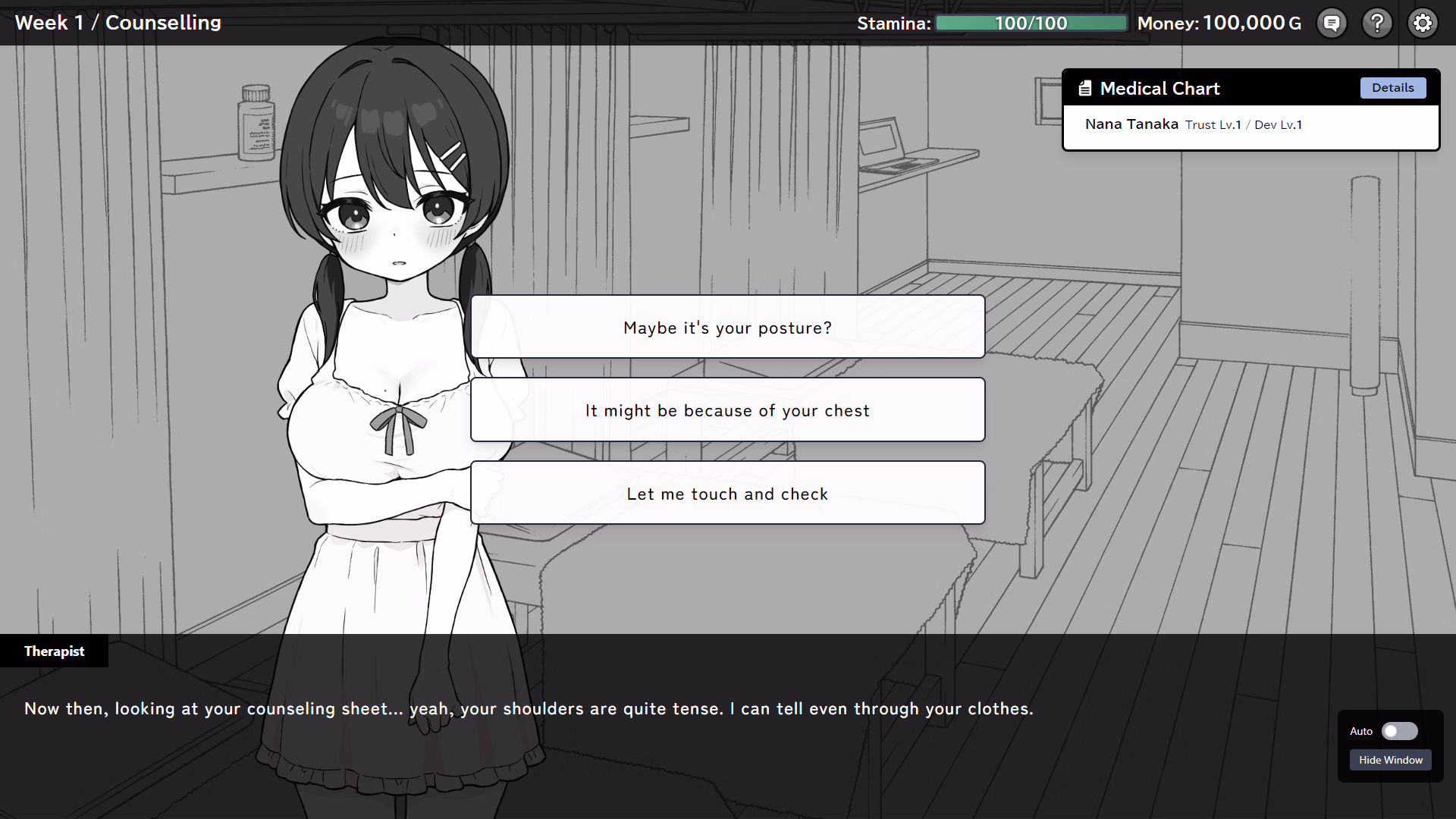 You’re a newly opened massage therapist. No customers, and loan repayment is due in 3 months (12 weeks)… That’s when she appears: Nana Tanaka, a busty beautiful girl. “My shoulders are so stiff… Can you help me?”