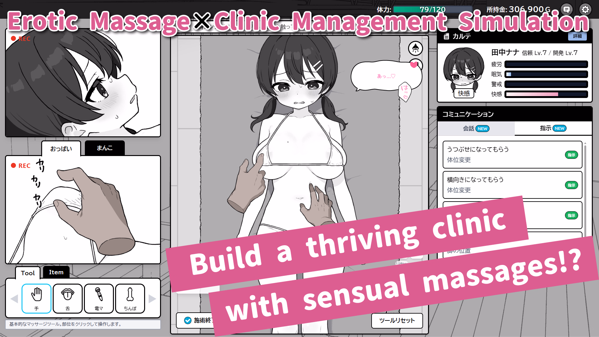 A simulation game where you deepen your relationship with Nana while managing funds and various stats to run your massage clinic. Repeat the cycle of “Counseling â Massage â Action Selection” and aim to repay your debt within 3 months (12 weeks). Counseling Phase