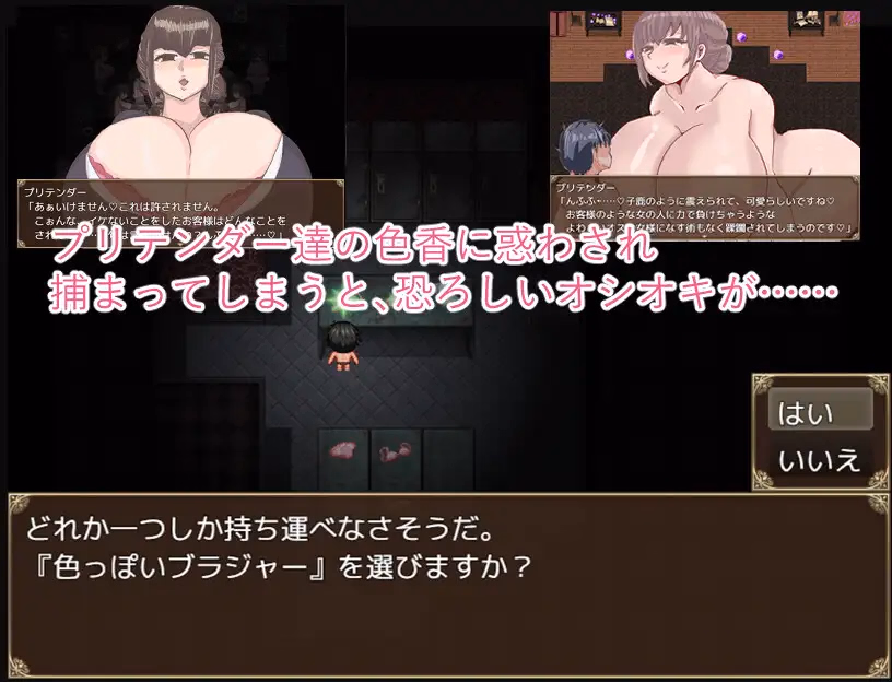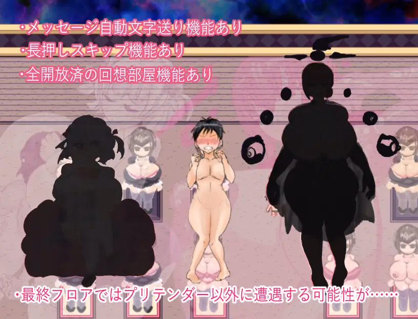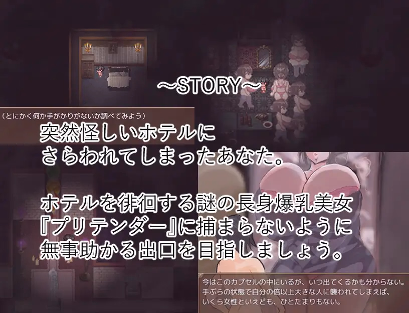 Abducted and stripped bare, you find yourself trapped in a nightmarish hotel ruled by bewitching, towering, curvaceous women—the “Pretenders”.