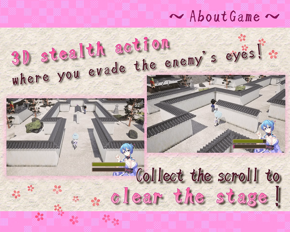 The player controls the main character, Ayame, and aims to retrieve scrolls on the stage while being careful not to be detected by the enemy.
