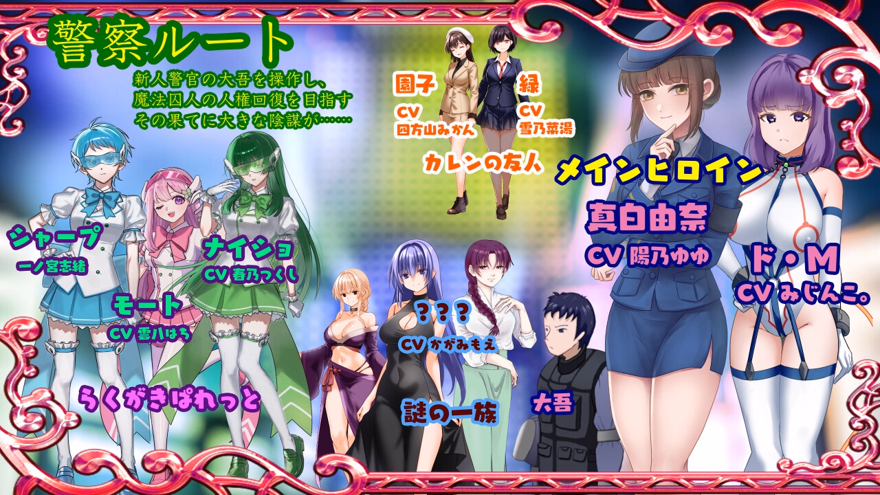 Karen Nonaka, a girl who admires magical girls. On the day her wish comes true and she can use magic, she is arrested under a suddenly enacted law prohibiting magic. She is sent to a prison called the Special Abnormal Ability Containment Facility. There, under the guise of rehabilitating magical prisoners, acts too shameful to speak of are carried out as if normal. Can Karen full her sentence safely, or else— After completing the common route, you can choose from 4 branching routes. The main ero scenes feature over 40 animations with full voice. The regular scenarios are also packed with thrilling scenes. Over 20 characters with H scenes. The main scenarios in the regular parts are also fully voiced. Battles include action battles and command battles. Numerous mini-games. Many deduction elements.