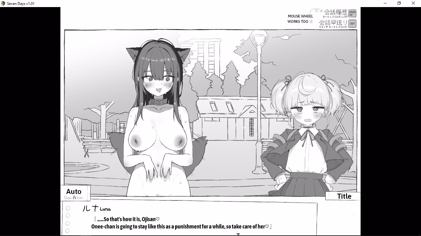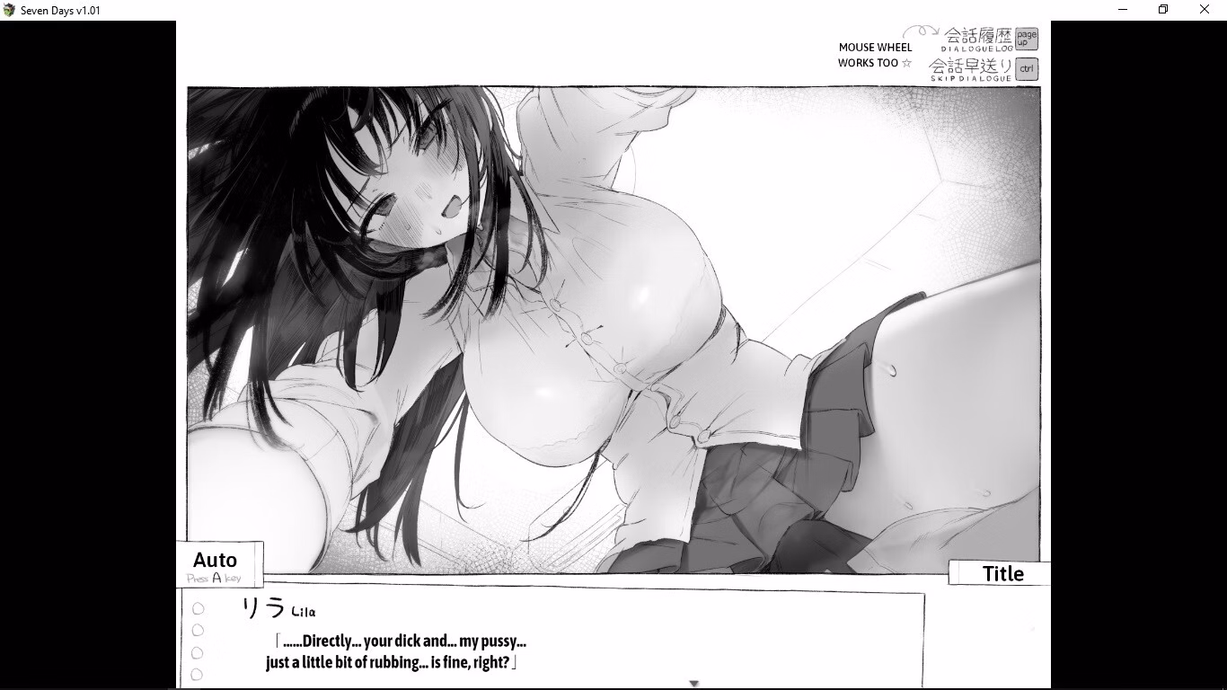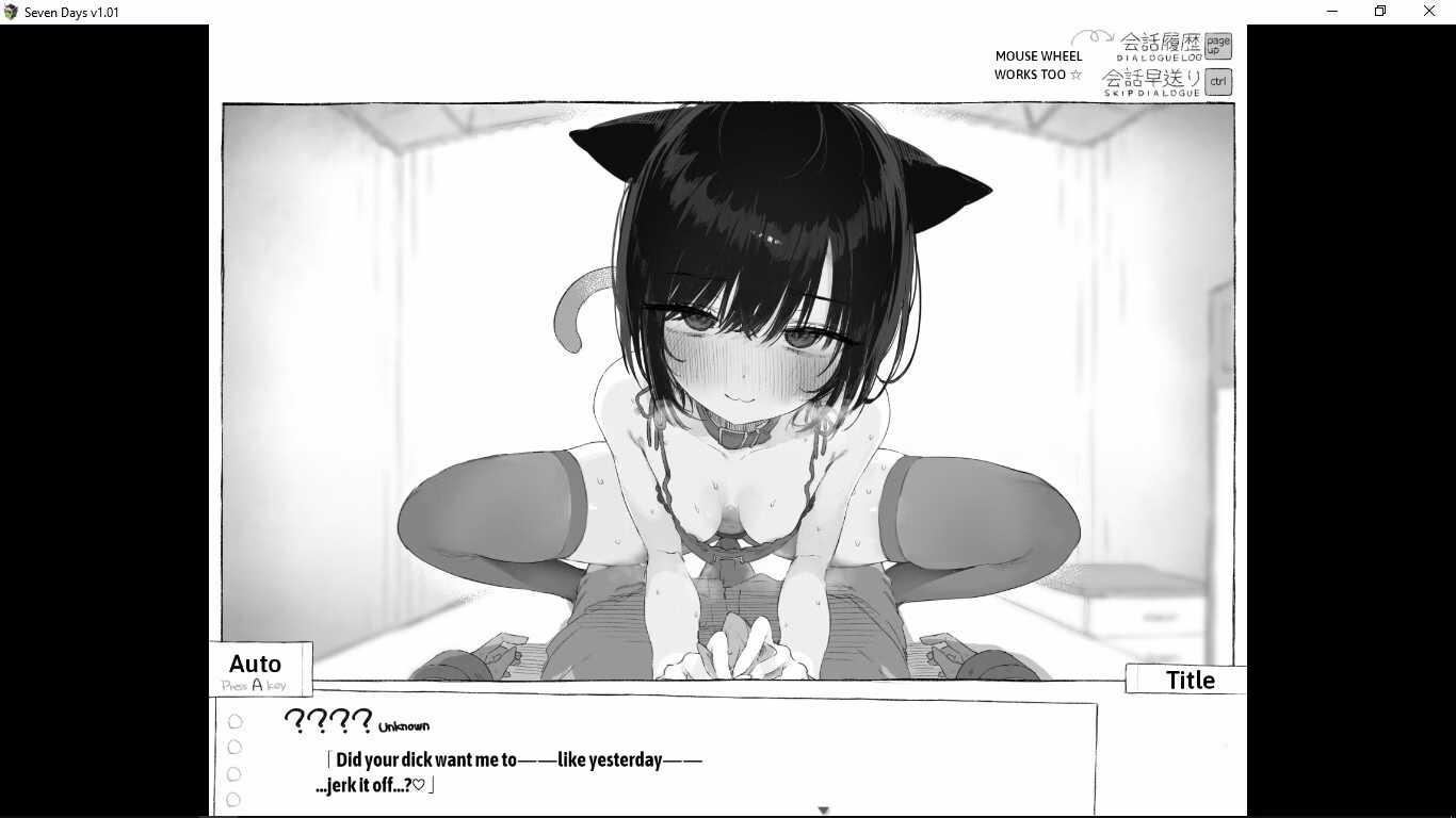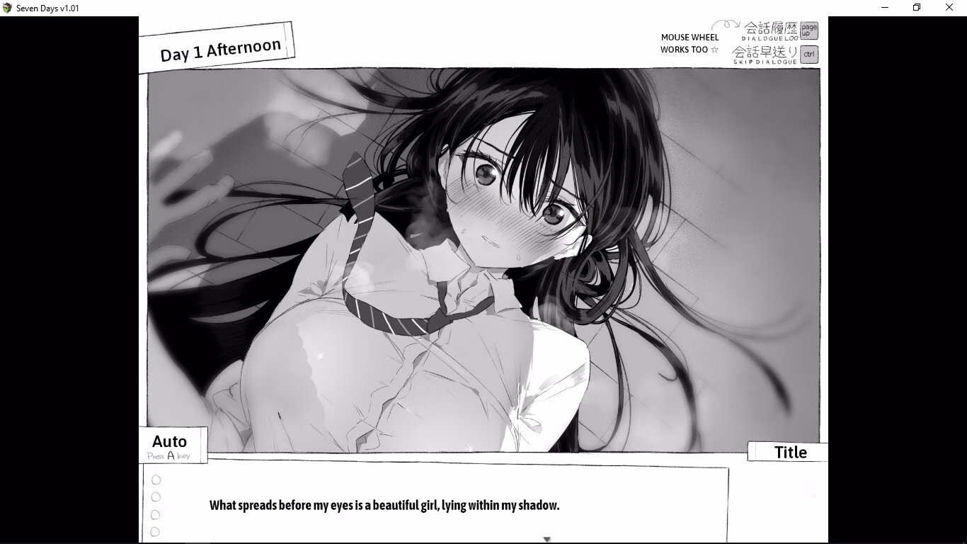 A mystery visual novel presented in striking monochrome artwork. You awaken in confinement with a high‑school girl you’ve never met, and together you must endure seven days under the watch of a mischievous mastermind. Your willpower is tested against constant temptations and bizarre directives.