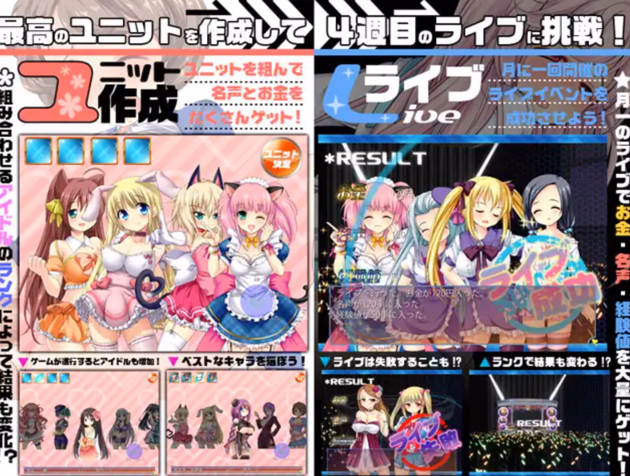 Create the industry’s greatest pop group of 48 members! Determine star quality with -> SEX! Train talents with -> SEX!! Promote girls and sell products with -> SEX!!!