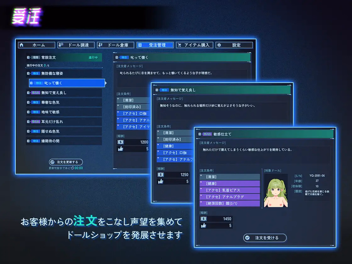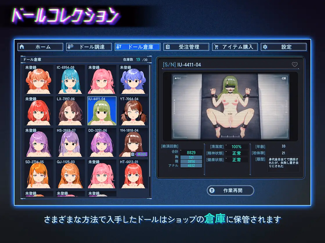 A different girl appears each time: With a random generation system, a new encounter awaits you every time you play.A fusion of business and eroticism: You can enjoy various “modifications” while expanding your doll shop.This work was created using Unity.