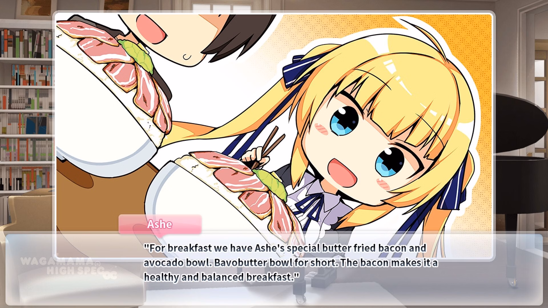 Kinetic novel with 7 side stories featuring the heroines of WAGAMAMA HIGH SPEC which can be selected from the start of the game. Choose your favorite heroine’s story to read first!Character design by Utsunomiya SumireSD Character artwork by nanateruScenrio written by Mojasubi, Nisshi~, Tsubaki MataTheme song, “Hey Darling!” by MatsushitaFull Japanese voice (except protagonist)Save/Load functionality, Quick Save/Quick Load for quick save state accessBacklog jump feature. Jump back to previous scenes even without save dataFavorite voice feature. Listen to your favorite voice lines by favoriting them for later listeningCG gallery feature. Enjoy unlocked, high quality illustrations after completing the game