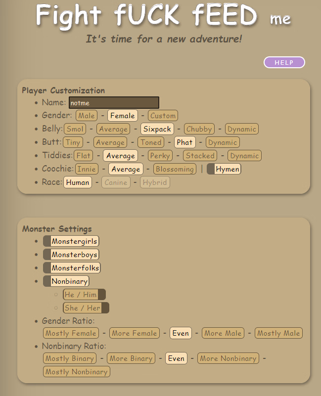FightFuckFeed.me is a pred-focused vore sandbox text adventure with jungles to explore and castles to conquer. The game runs on lots of procedural content, so each playthrough will be a unique experience. Increase your stats by eating cute monstergirls, and gain allies by fuckin em. Visit the website for the latest version of the game!