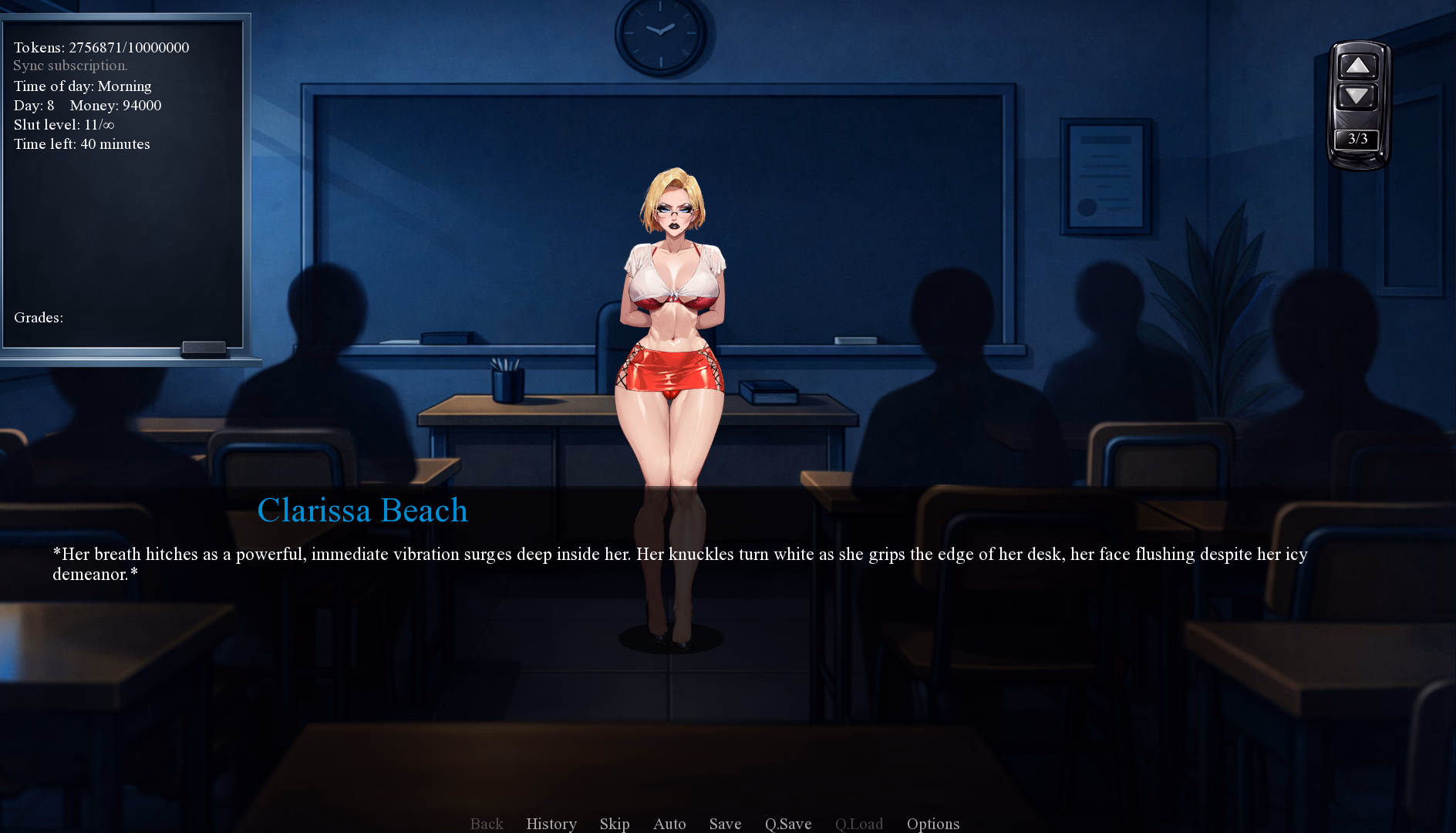 Player text input, so you can basically talk to her.10 corruption lvls for Ms. Beach10 cgs+4 anims + Gallery feature6 locations you can visit alone or with Ms. Beach.Side characters: the janitor, the principal, and a police officer. You can have conversations with them and Ms. Beach (you + Ms. Beach + one other character).Wardrobe + clothing: 3× panties, 2× bras, 3× bottom clothing, 2× top clothing, 2× haircuts. The wardrobe system is designed to be moddable, so if you know how to draw, you can go to the wardrobe folder and add more clothing. Just don’t forget to write descriptions. She’s aware of what she’s wearing.Remote controlled vibrator – 3 vibration strengths modes. Can be anytime, including during a lesson.Interface languages are English/Russian. You can try asking her to speak German/French/etc. It may or may not work.