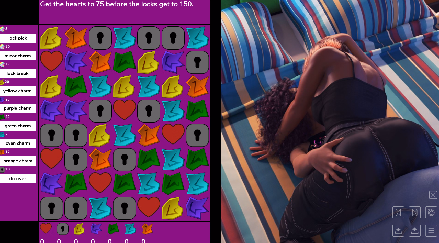 Puzzle Date is a side project that I wrote while Mortze was working on SWM. It is quite different than our other games. Although it has multiple sex scenes and some semblance of a story, including a Male path and a Lesbian one, it’s really a Match3 game where the Match3 parts are a metaphor for what is going on in the date. Go in with eyes open.