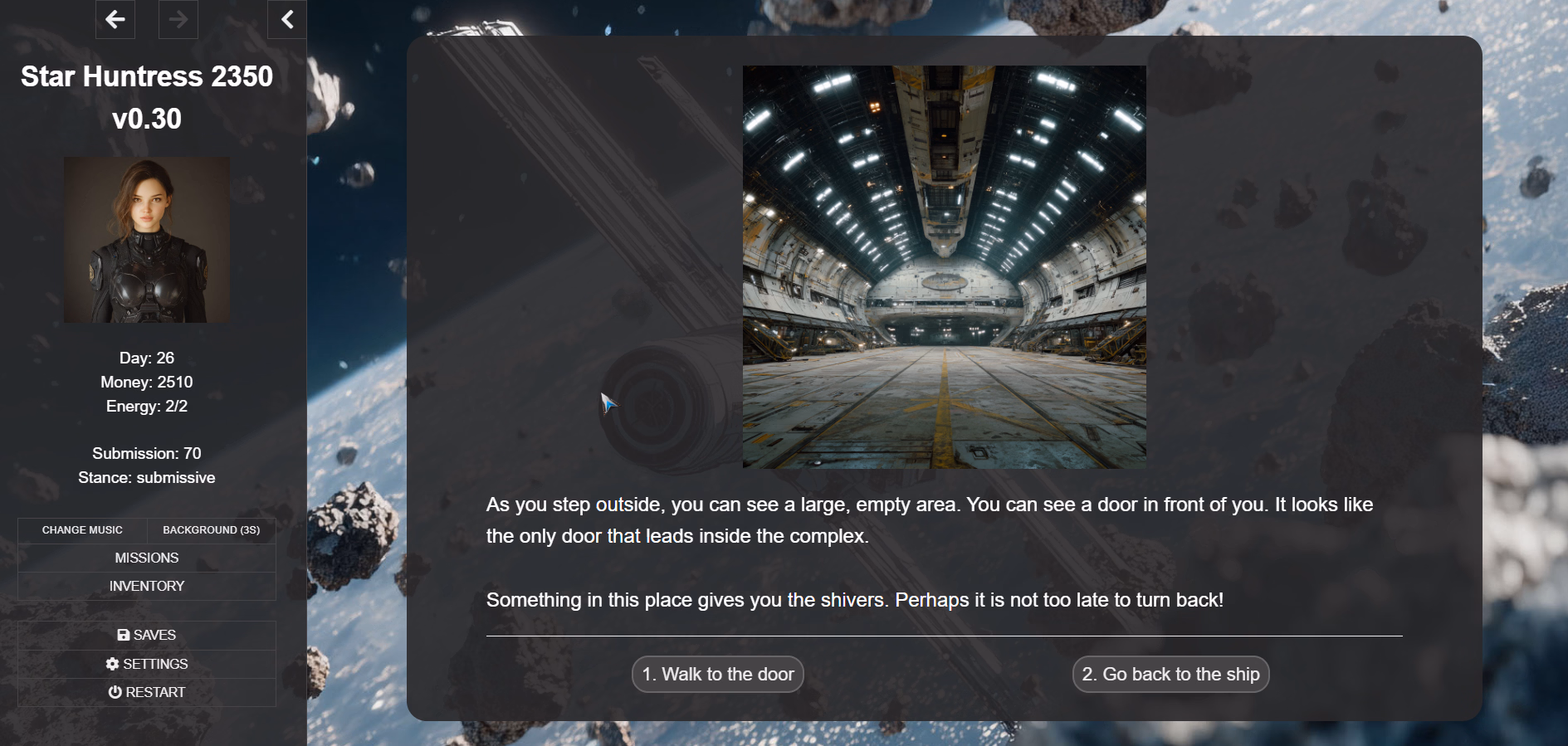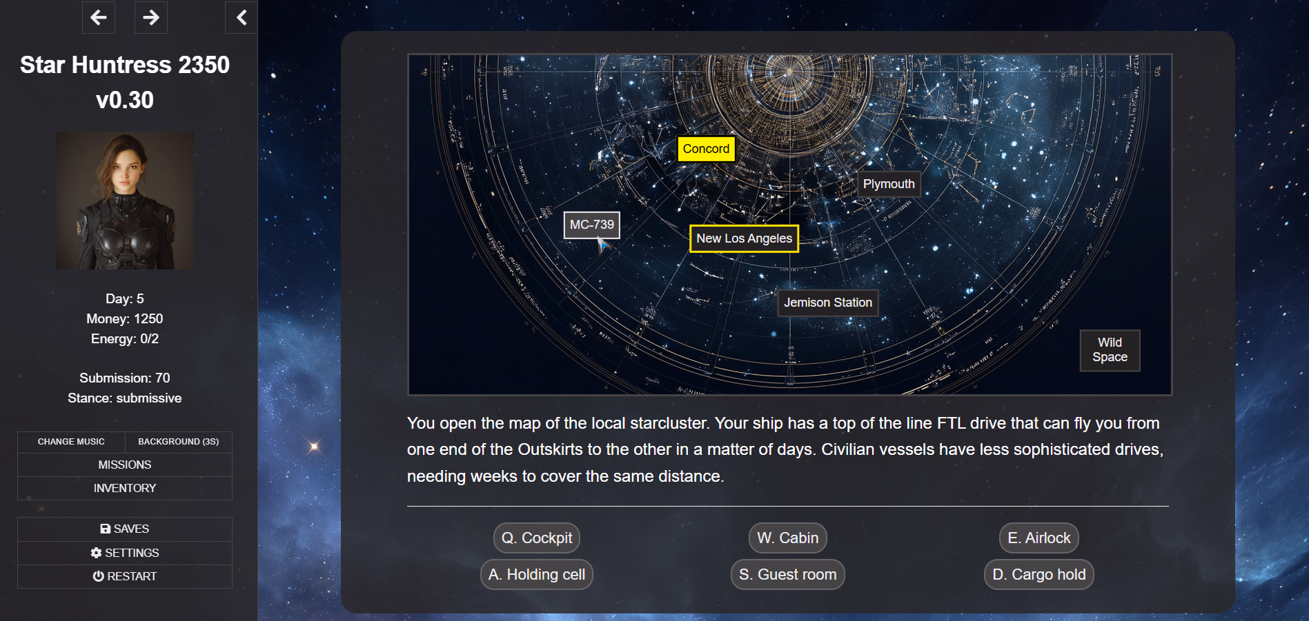 Wild Space: An empty spot where you can park your ship if you are tired of paying a docking fee. (Tip you can do the same on MC-739, and this way there are no baddies.) There are 3 ships that will attack the mc. If you beat them you get a reward. If you hack them you can escape but there is no reward. Wild Space bad ends: with the first 2 ships, you get a bad end. With the third ship you get a slave path that concludes with the mc being brought to the slave market.