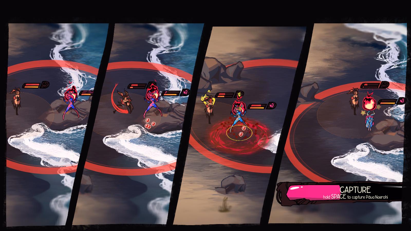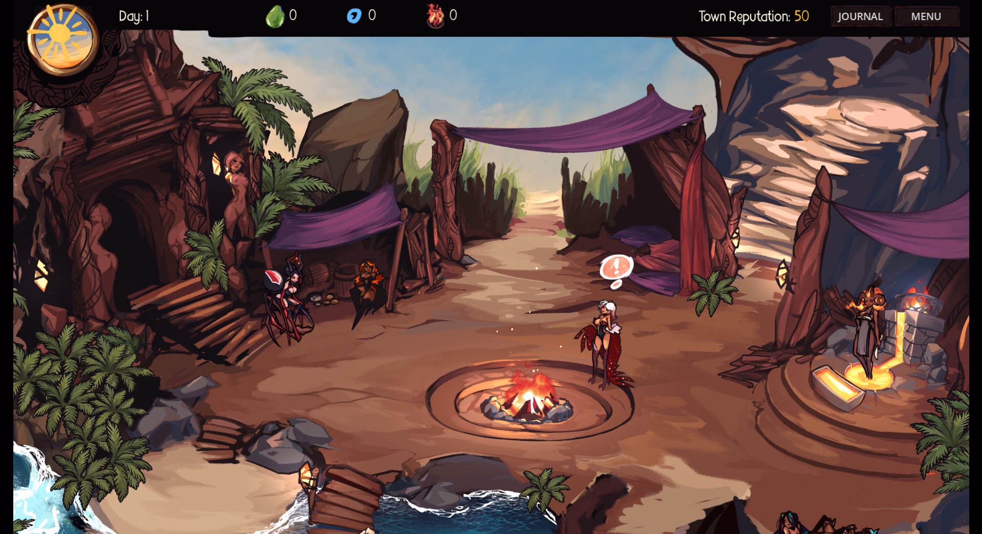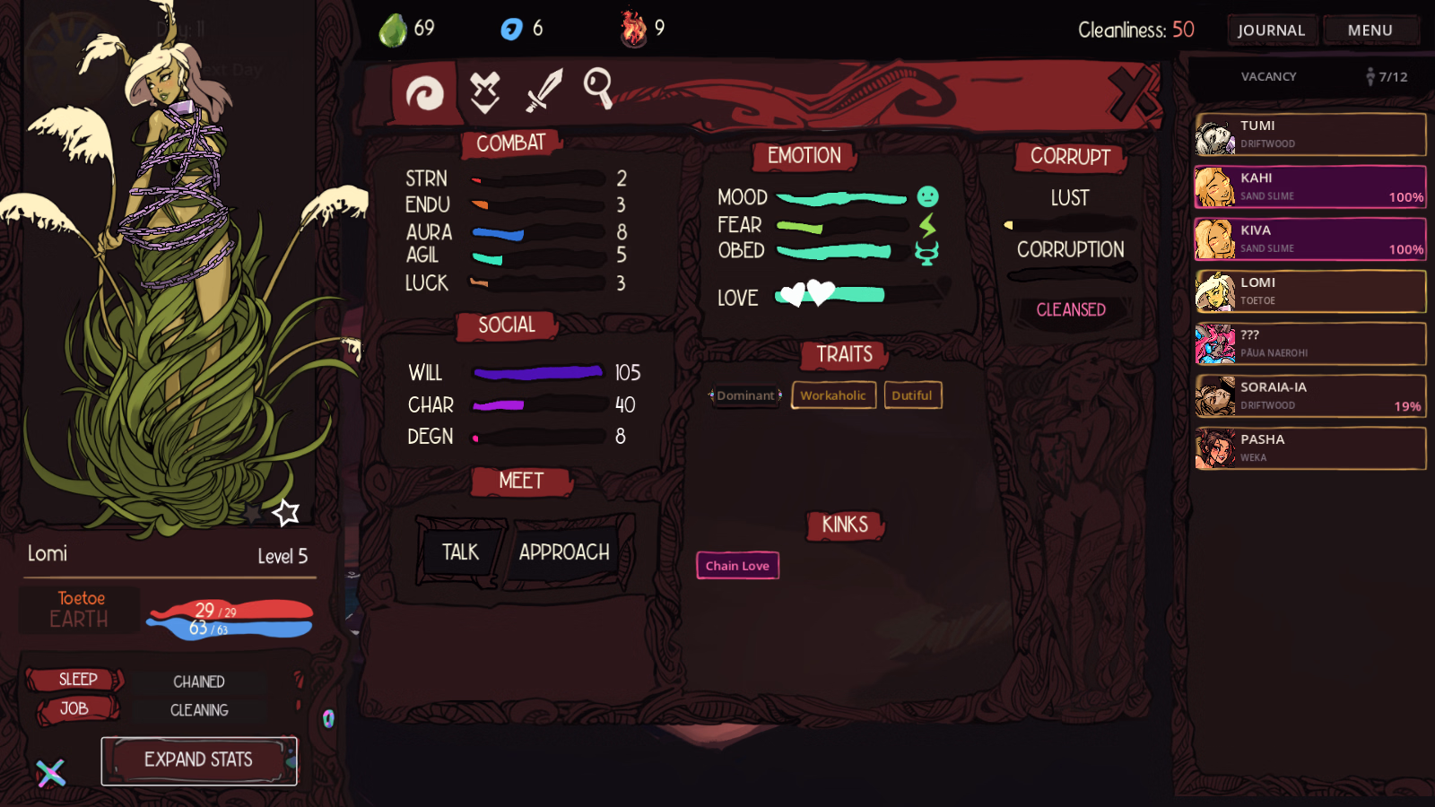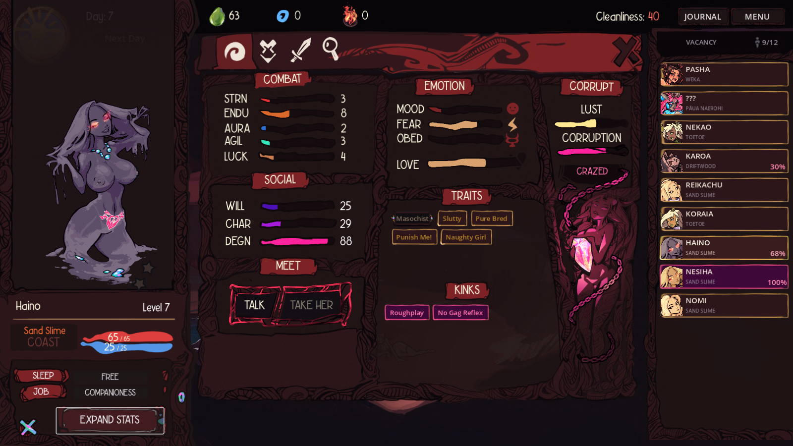create creature/generate creature/save creature day/night cycle save/load town with npcs talk/gossip/quest/specialization quest chain. q001 – teach movement, enter wilds, combat, levelup, capture. q002 – unlock home, talk/approach system.q003 – capture, cleanse, train, tribute. q004 – specialize captured creatures. new enemy type.q005 – story “move forward” begins. home has storage, rooms, jobs. Can assign girls to positions (literally and figuratively) overnight resolver does stats, jobs, relationships. escape + bounty system job rabbit hole. (adventure, bounty, exploring, hole) all stats for girls implemented (combat / social /emotional spectrums) level up creatures increases combat stats. (others improved via interaction.) stat “achievement” stars.libraries for Goddess/Species/Order/Traits/Kinks/Abilities written and implemented de-corrupt creature via talk / approach personalities x10 (+3 “trauma” ones). creatures variations:Each species have 5 x 5 variable features (variable colour/hair/face/outfit/extra).Species specific talk/sex actions. Likes/dislikes. five creatures that can be caught/trained/combat with: – Pasha, npc_pasha/weka. Fast hitting frail assassin. – Paua, npc_//. bruisy frontliner. – Sandslime, shilder/tank – Toetoe, frail mage with heal & wind/ice spells. – Driftwood, thorns/rupture frontlinerStats pages for each creatureActive stats: Page full of numbers for each girl’s Combat/Emotional/Social Stats.Equipment (shell — for when inventory and items are introduced)Skills. Skill tree for each species. Combat Abilities. Combat orders.Legacy Stats: Page full of info, sex history, personality, extra info.Combat Skills:Each species has 5-6 combat abilities, in a skilltreeMost are unique — some are shared. Split between actives and passives.Tiers for each skill, for specialization.Combat:Auto mode (girl switches to using player assigned combat orders)Party — party of 1/2/3, party members follow, and orders resolve based on combat orders) Status reaction system — based on harmony reactions. Bleed/burn/shear/rupture/chill/silence/thrall.Status + status burst reactions. Maps: – home: temple. Unlockable zone for more storage space, via q003. – town: NPC hub. Zoom and scroll. ay/Night – wilderness: wilds01beach — the first combat map. Day/Night. enemy spawns based on time of day.