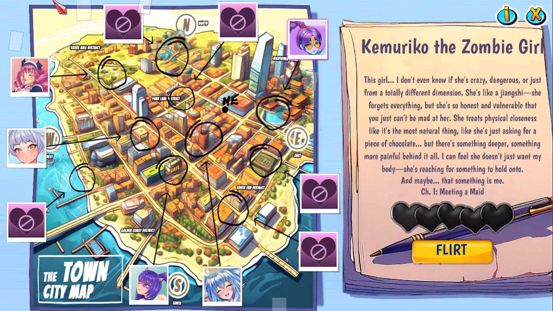 Flirt with stunning girls in this interactive text-based interactive fiction, including a seductive vampire punk, a semen-hungry zombie girl, and a sweet soaring angel. Uncover their secrets, choose your favorite, and unlock steamy 3D scenes.​