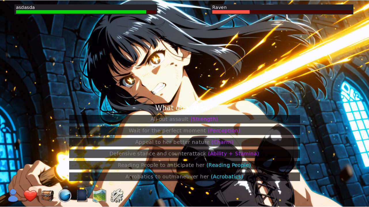 Many systems are functional (maps, minigames, three eras, dungeon framework, brothel prototype), but large parts of the dialogue, narration, and balancing are still infull.