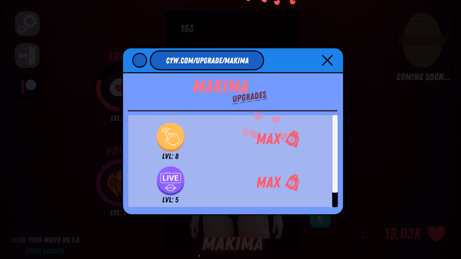 Click Your Waifu! is a small idle/clicker game where you… well, click your favorite waifu. In this very first alpha youâll find Makima, with more characters coming over the next few weeks. How to play