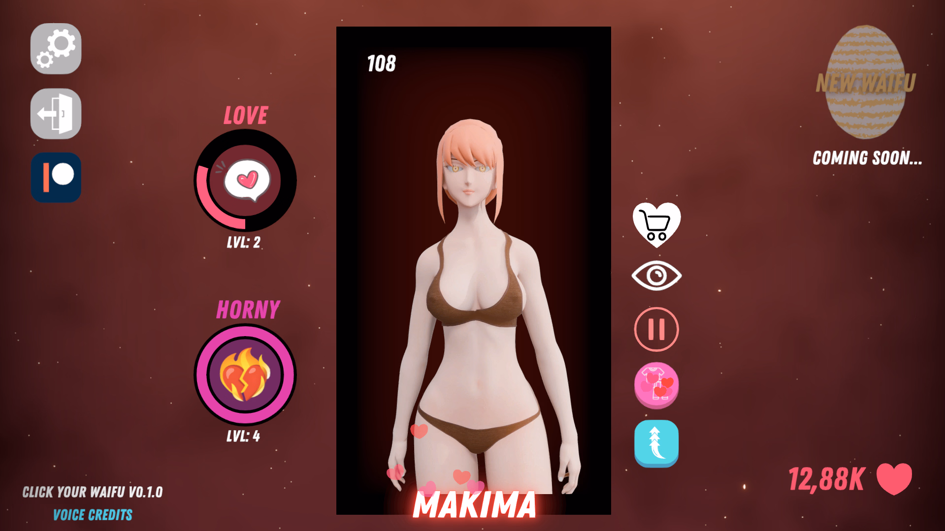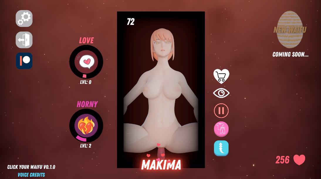 The gameplay is simple and relaxing: Click the waifu to earn hearts. Use the blue icon at the bottom-right to open the upgrade & automation menu. Boost your production, unlock higher stages, and watch the animations evolve as the Horny bar rises. Itâs designed to be light, satisfying, and perfect to leave running while you do other things. This is an early alpha, so expect frequent updates, new waifus, and more content in upcoming builds.​