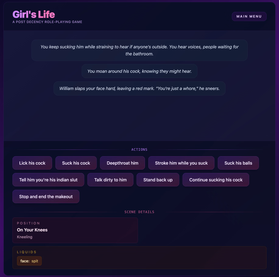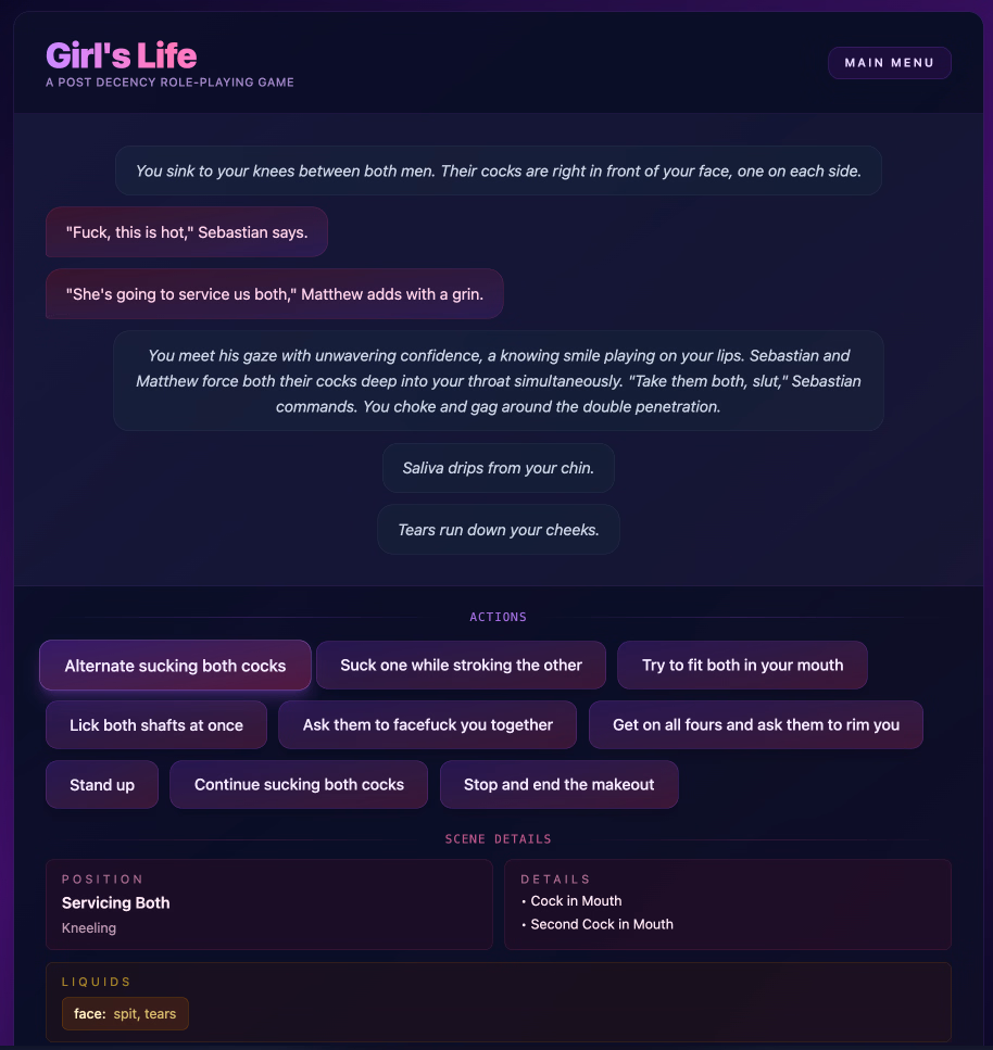 A sandbox, text-based life-sim game where you get to do whatever you want as a female character in a modern setting.