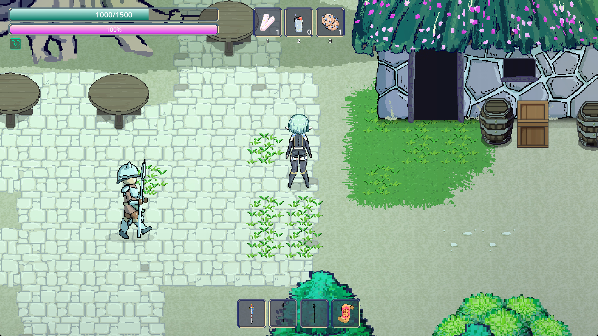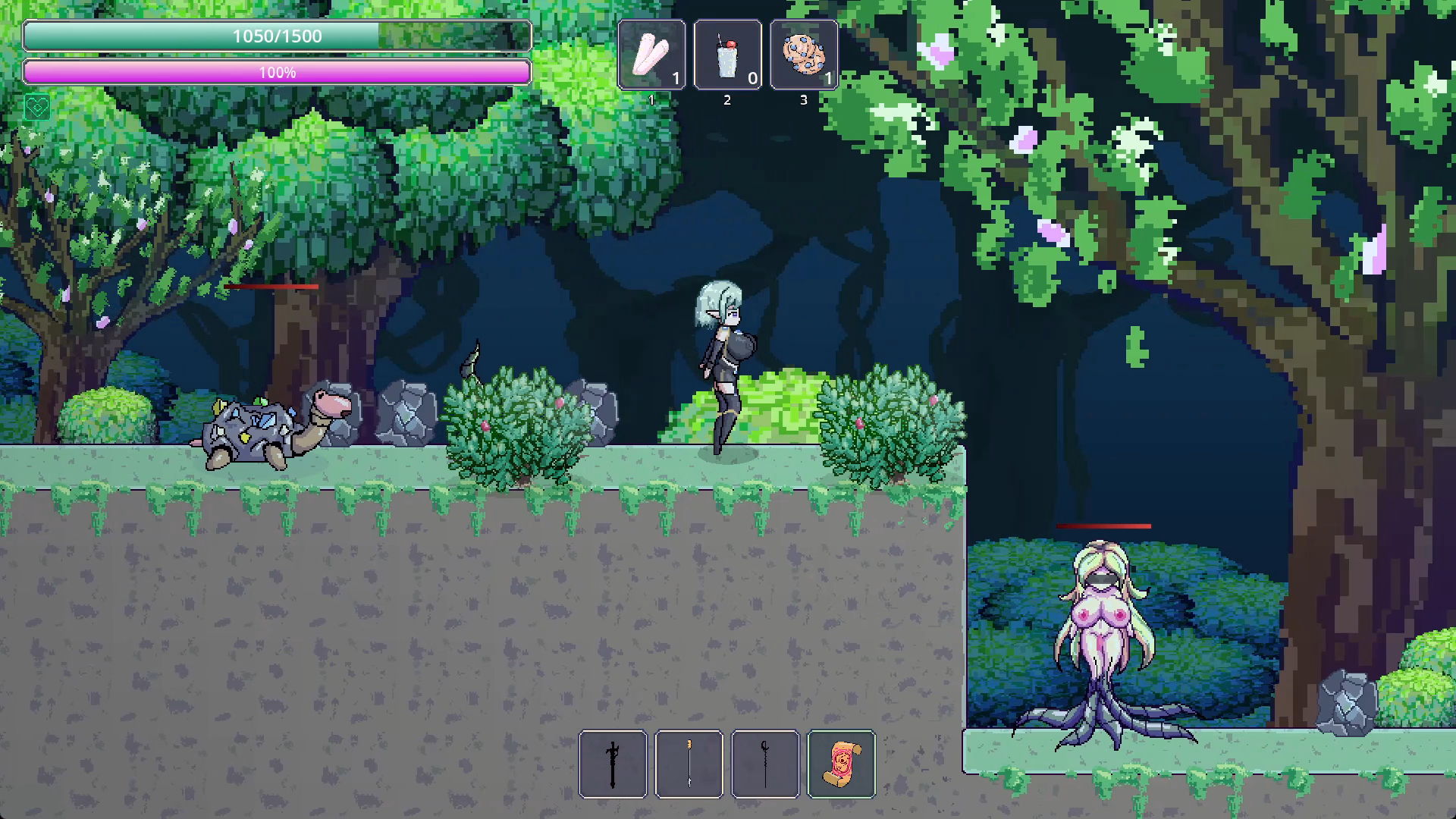 This is an adult fantasy 2D action game with a seamless transition between platformer and top-down action. Simple control that doesn’t require hours of getting use to. Collect materials to craft and upgrade weapons and to craft items to help fighting enemies easier. Help out the villagers to unlock lewd stories and collect rewards.