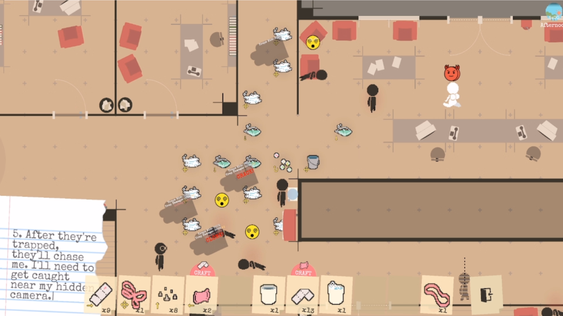 The main gameplay loop is moving around the office space (and other places) collecting supplies to craft traps. These traps will deal damage and push other employees around. Using one trap to push an employee into another trap will create a chain reaction dealing bonus damage for every trap in the combo.