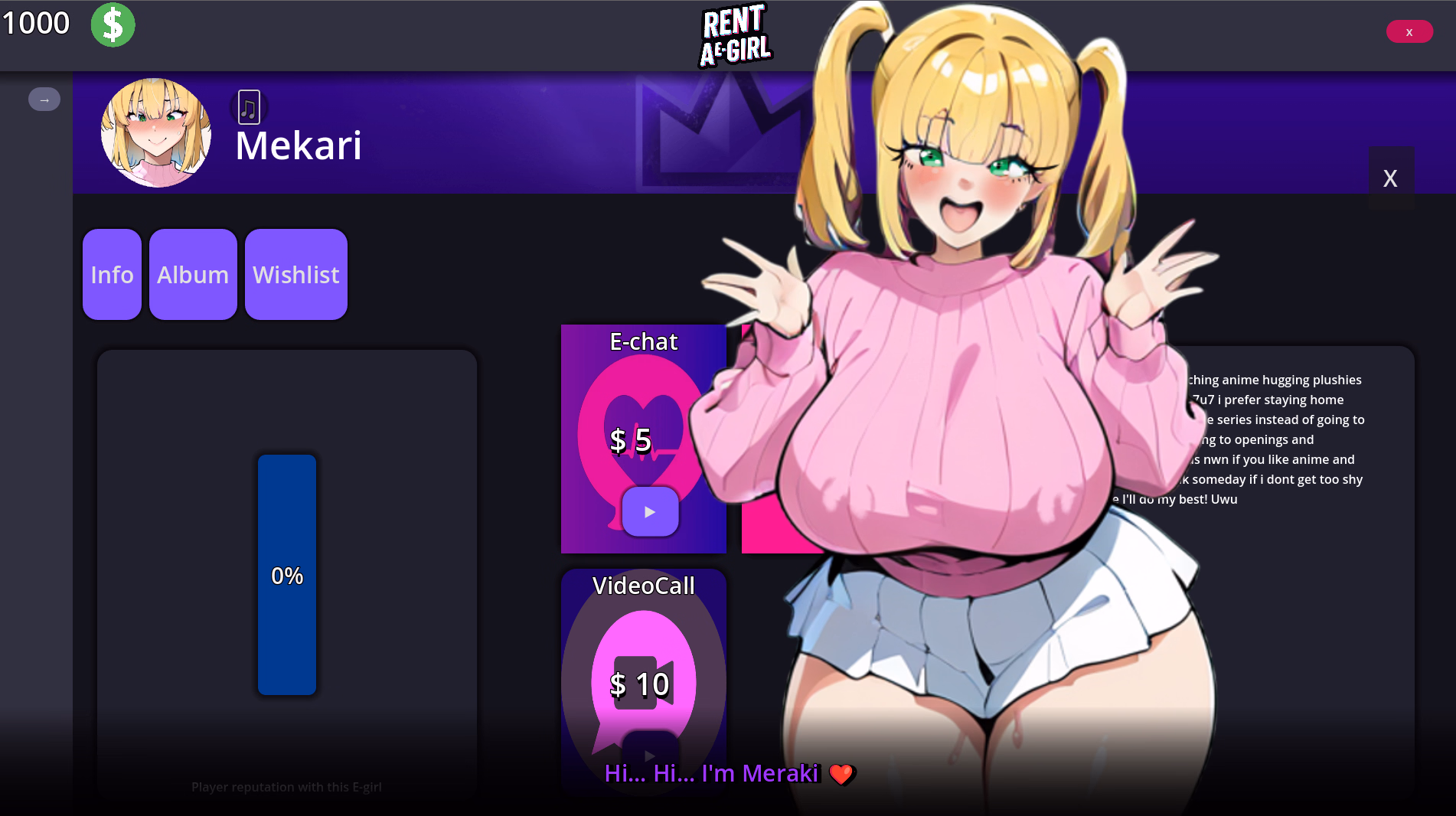 Welcome to Rent an Egirl, an adult game where connection goes beyond clicks. Immerse yourself in an interactive experience where you can rent the time of three unique egirls, each with their own personality, story, and secrets to discover.