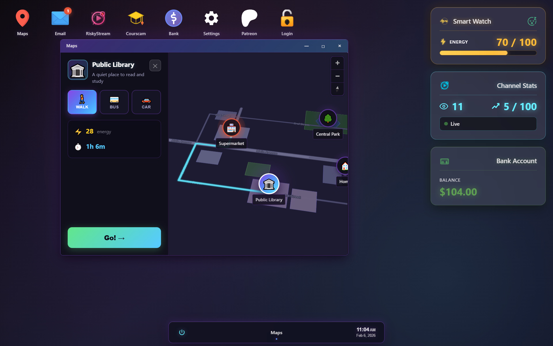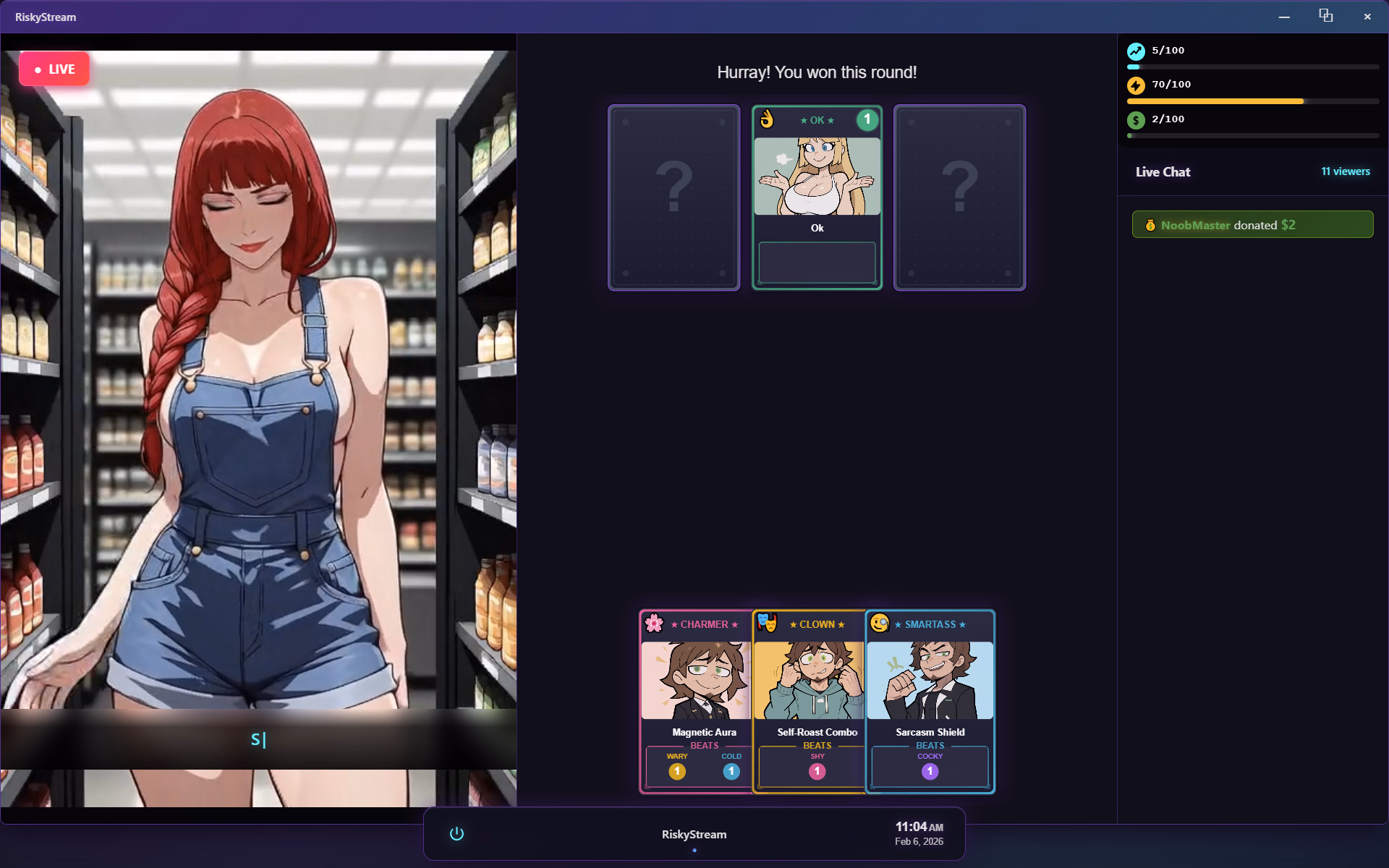 You start out as a no-name beginner streamer flirting with girls in public places, streaming every interaction live to an audience hungry for drama. The game plays as a card-based system where every move is a gamble. Build hype, manage risk, and decide when to push your luck — play it too safe and nothing happens, push too far and the stream crashes.