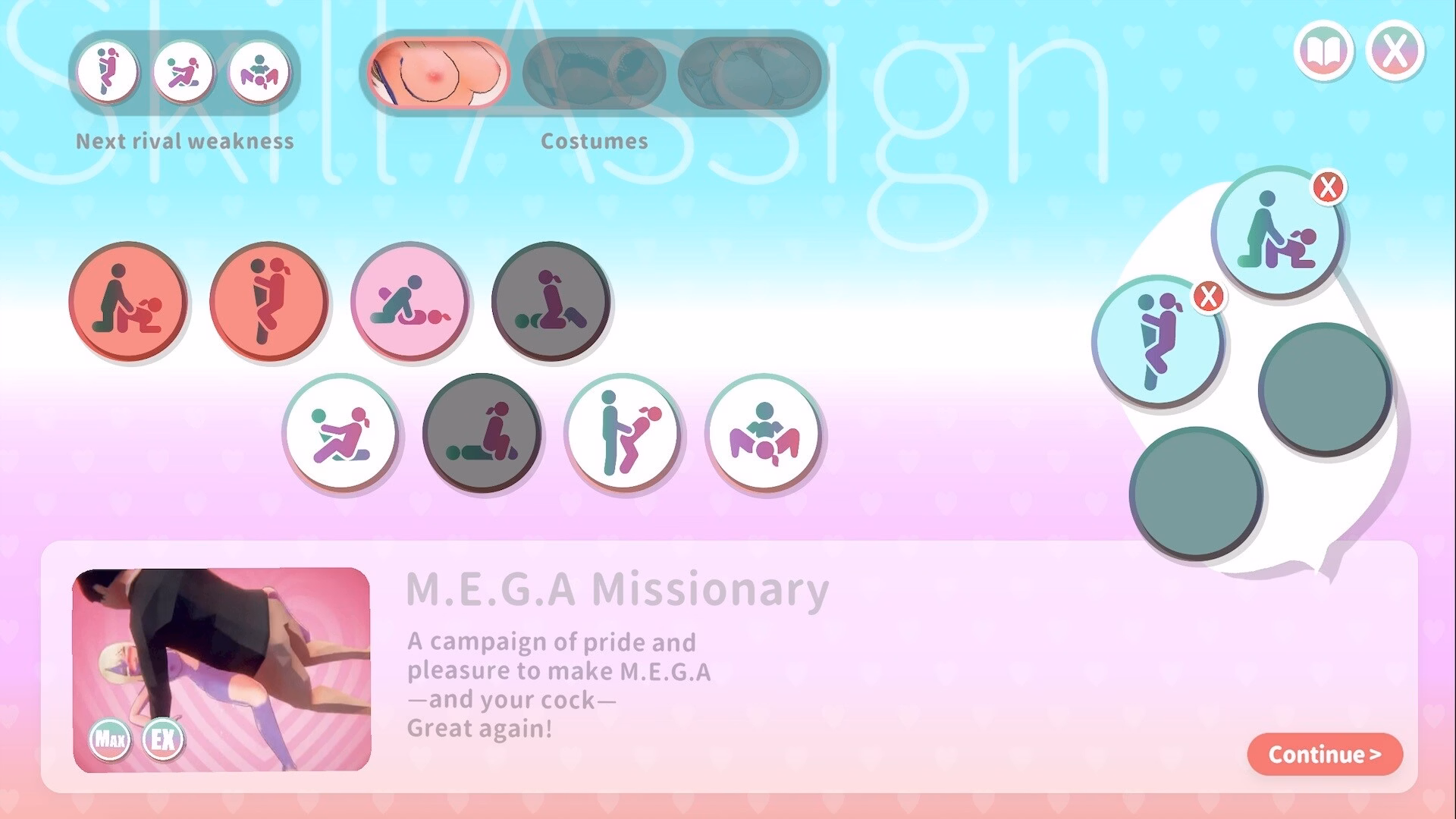 [Training] your intimate skills to enhance your performance, or memorizing the memories in [Gallery] to uncover hidden stories and ultimately unlock secret characters.