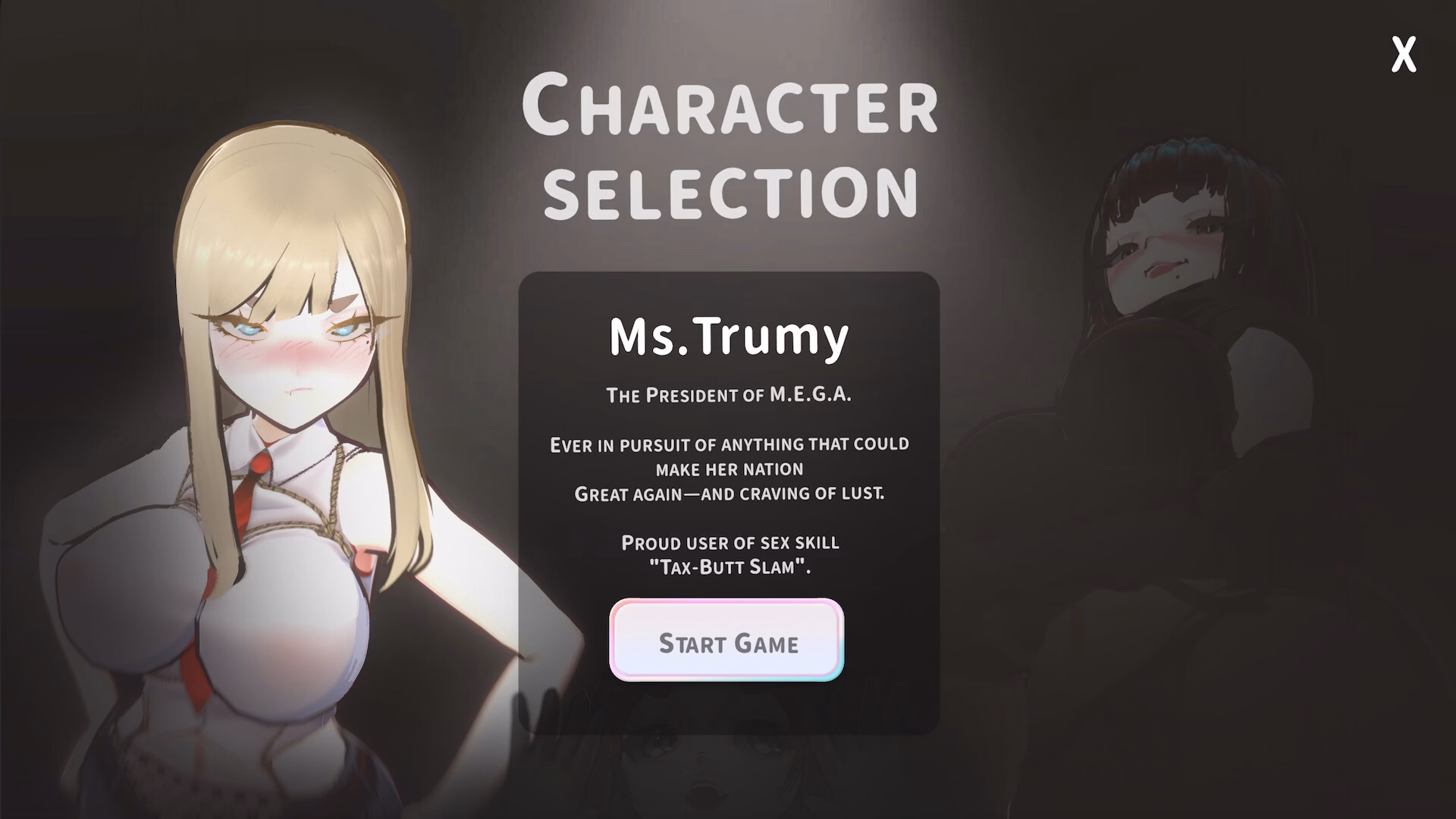 Will you help Lord Trumy bend the world to her will and make the “M.E.G.A” Great Again? The fate of the free world hangs in the balance, and only you can decide who will come out on top! Get ready to laugh, gasp, and blush your way through this one-of-a-kind gaming experience that promises to be the talk of the town. Are you ready to take on the challenge and become the Ultra Fuckin’ Fuckable Champion? Let the games begin!